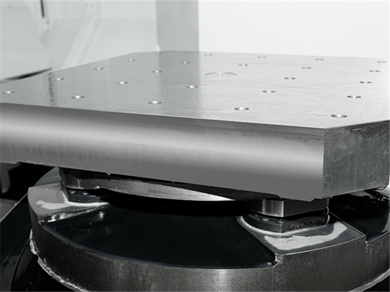 工作臺板與底座間采用四個(gè)大定位銷定位,同時(shí)兼具夾緊功能,可保證托盤剛性夾緊和精確定位,托盤的重復(fù)定位精度高。工作臺旋轉(zhuǎn)采用高精度牙盤定位,分度精度高、承載大。